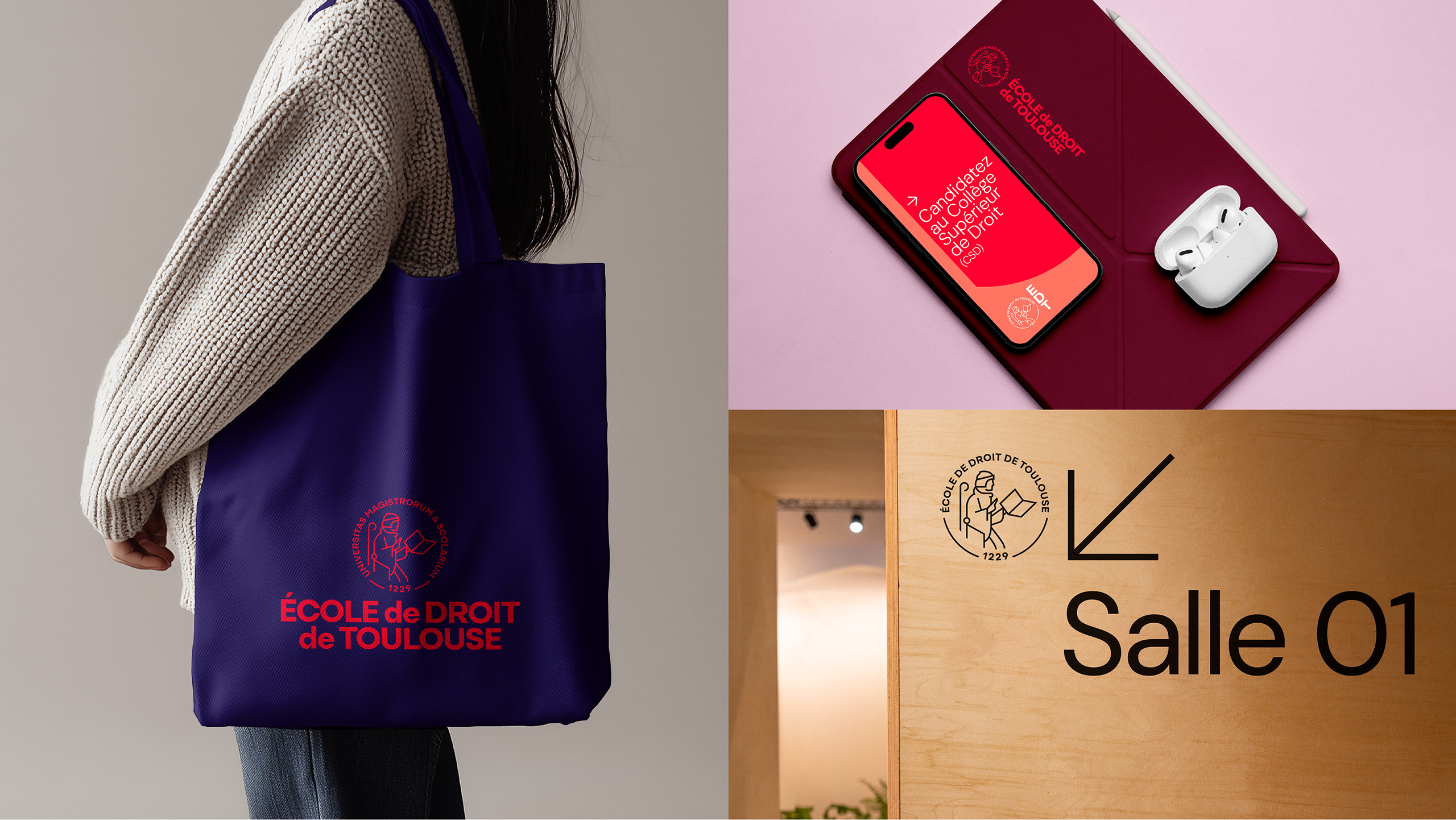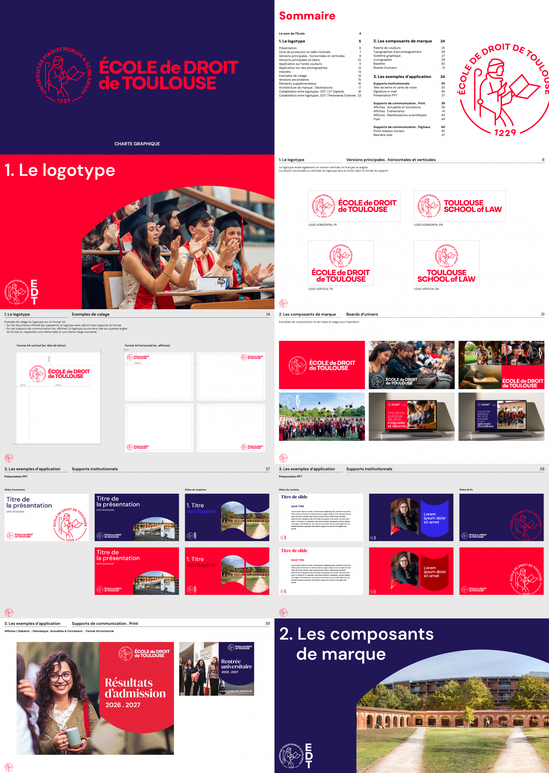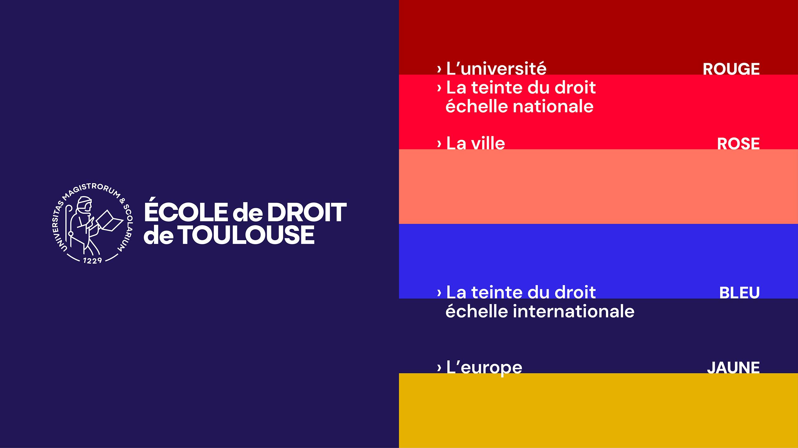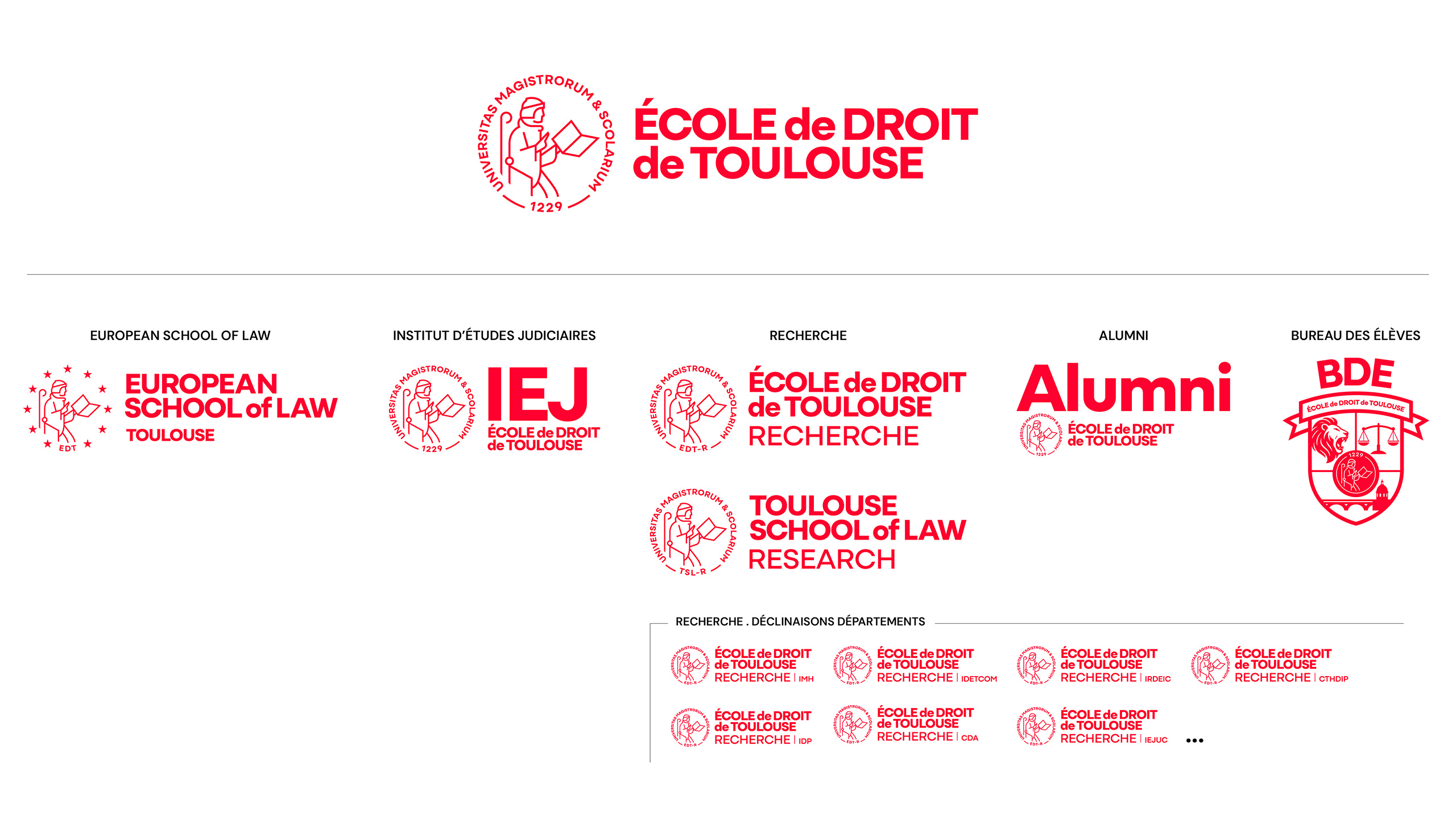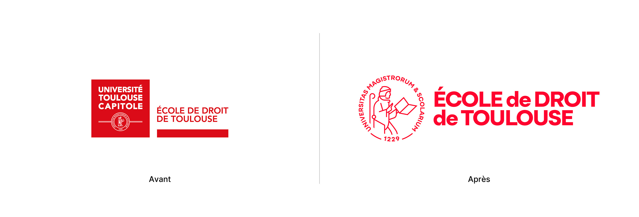 Création de la nouvelle identité visuelle de l’École de droit de Toulouse, suite à son changement de nom et de statut. Une identité qui s’inscrit dans la continuité : capitaliser sur les signes historiques pour ancrer l’école dans un héritage riche et profond.  Un sceau – symbole de transmission du savoir et d’appartenance à une communauté – revisité pour plus de clarté, d’ouverture.