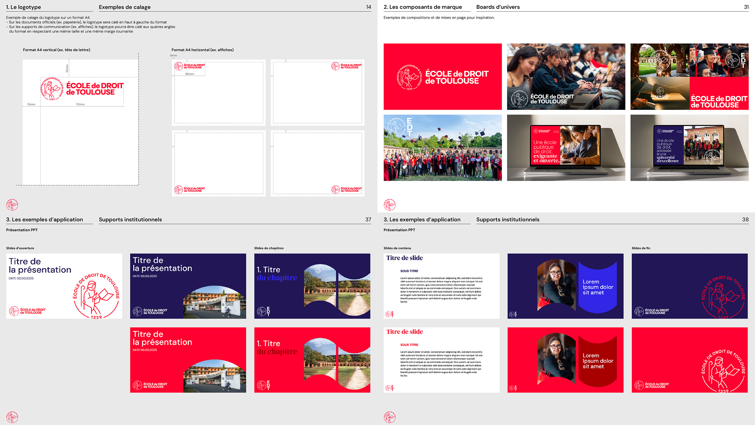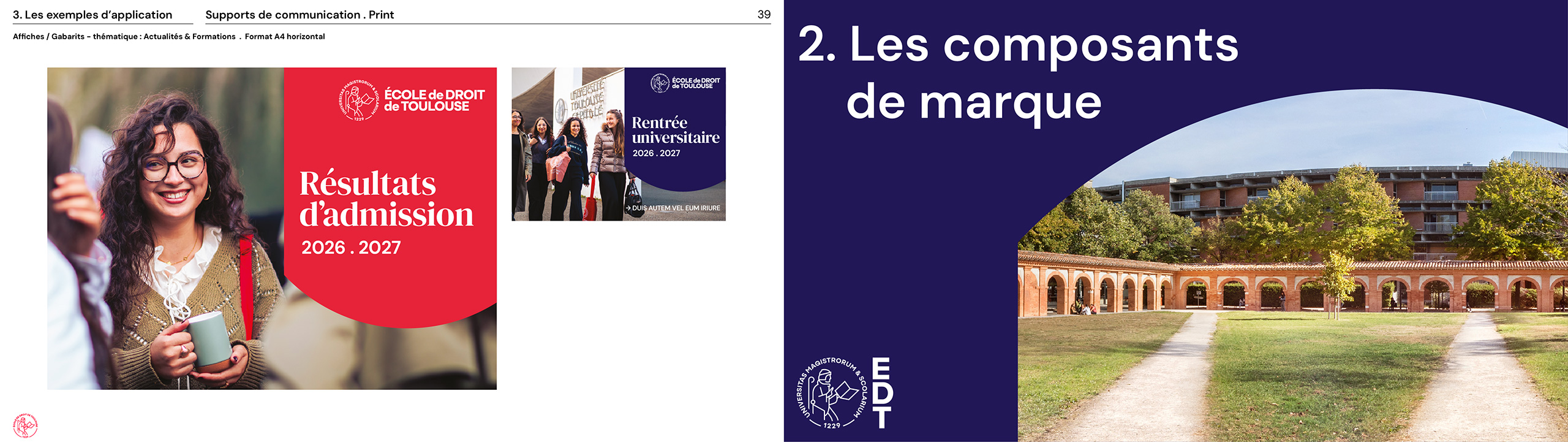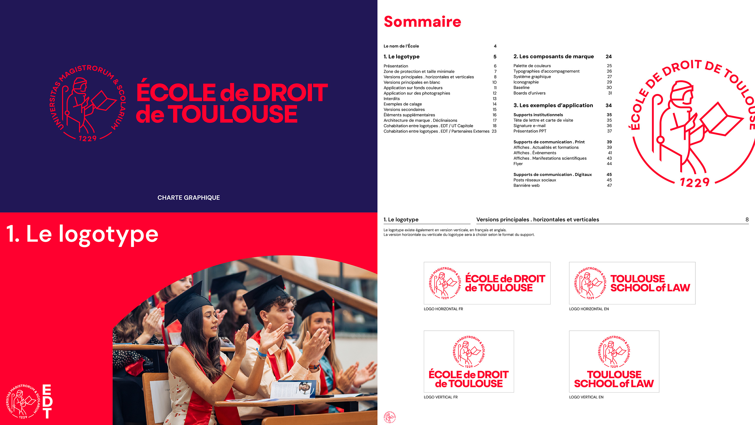Création de la nouvelle identité visuelle de l’École de droit de Toulouse, suite à son changement de nom et de statut. Une identité qui s’inscrit dans la continuité : capitaliser sur les signes historiques pour ancrer l’école dans un héritage riche et profond. Un sceau – symbole de transmission du savoir et d’appartenance à une communauté – revisité pour plus de clarté, d’ouverture.
